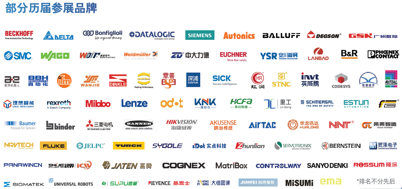 招展启动以来,已有行业知名企业包括:奥托尼克斯、宾德、德夫尔、鼎实、加玮、佳尔灵、精奇、精研技术、科迪通达、科瑞、领航机器人、贸泽电子、明治传感、虹润、合熠智能、荣越电气、深视智能、神武、视界纵横、思谷智能、思沛泽、燧石、天立、同创、万捷电子、瓦特尚、魏德电气、尤提乐、意普兴、友上智能、零点等率先确认展位,涵盖传感技术、机器视觉、工业通讯、驱动与控制技术、连接技术、气动元件等核心领域,报名热度持续攀升中。