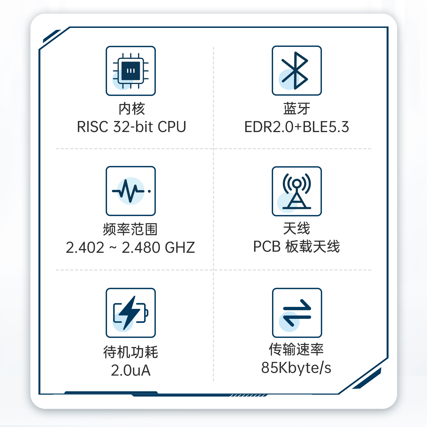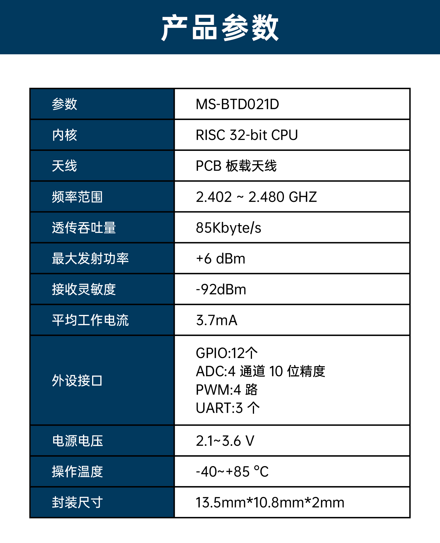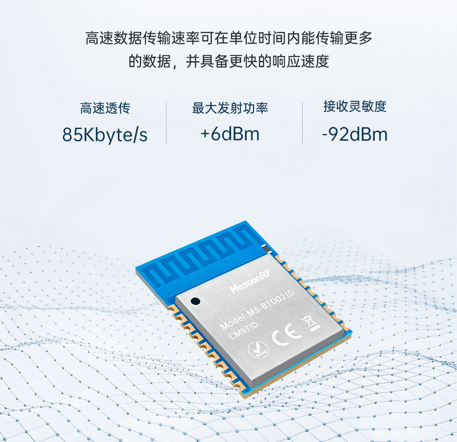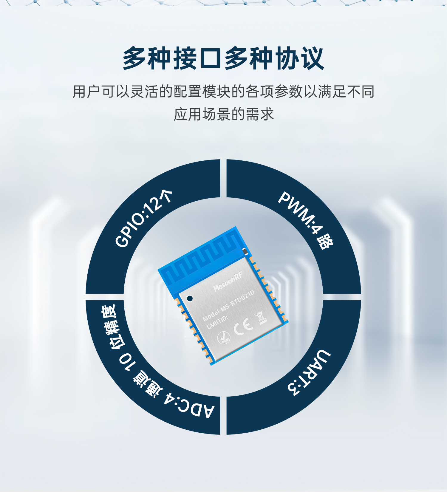 MS-BTD021D支持SPP(经典蓝牙)和BLE (低功耗蓝牙),双模技术使其能够在传统蓝牙和低功耗蓝牙之间无缝切换,用户只需要进行简单的设置就可以实现串口与手机之间的无线传输。模块内集成了丰富的AT指令,用户可以灵活的配置模块的各项参数以满足不同应用场景的需求。同时模块内还集成了UART/ ADC/SPI/USB等丰富的外设接口,可根据客户需求定制开发各种项目。