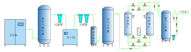变压吸附制氮工艺流程分为三个部分:气源压缩、净化、PSA分离。