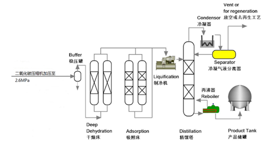电子级二氧化碳以食品级二氧化碳为原料,采用深冷精馏+物理化学吸附的工艺生产。食品级二氧化碳纯度一般在99.9%以上,杂质较少,CO、H2含量较低,利用纯化新工艺,能有效的除去产品中相关的杂质,生产过程中原料损耗低、纯化新工艺中的能量平衡并回收利用,电耗等较低,流程相对简单可靠,产品收率高,投资省。