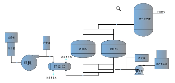 VPSA真空变压吸附制氧工系统主要由鼓风机、真空泵、切换阀、吸附塔和氧气缓冲罐组成。原料空气经吸入口过滤器除掉灰尘颗粒后,被罗茨鼓风机增压后进入其中一只吸附器内。吸附器内装填吸附剂,其中水分、二氧化碳、及少量其它气体组分在吸附器入口处被底部的活性氧化铝所吸附,氮气被上部的沸石分子筛所吸附。而氧气(包括氩气)为非吸附组分从吸附器顶部出口处作为产品气排至氧气缓冲罐。