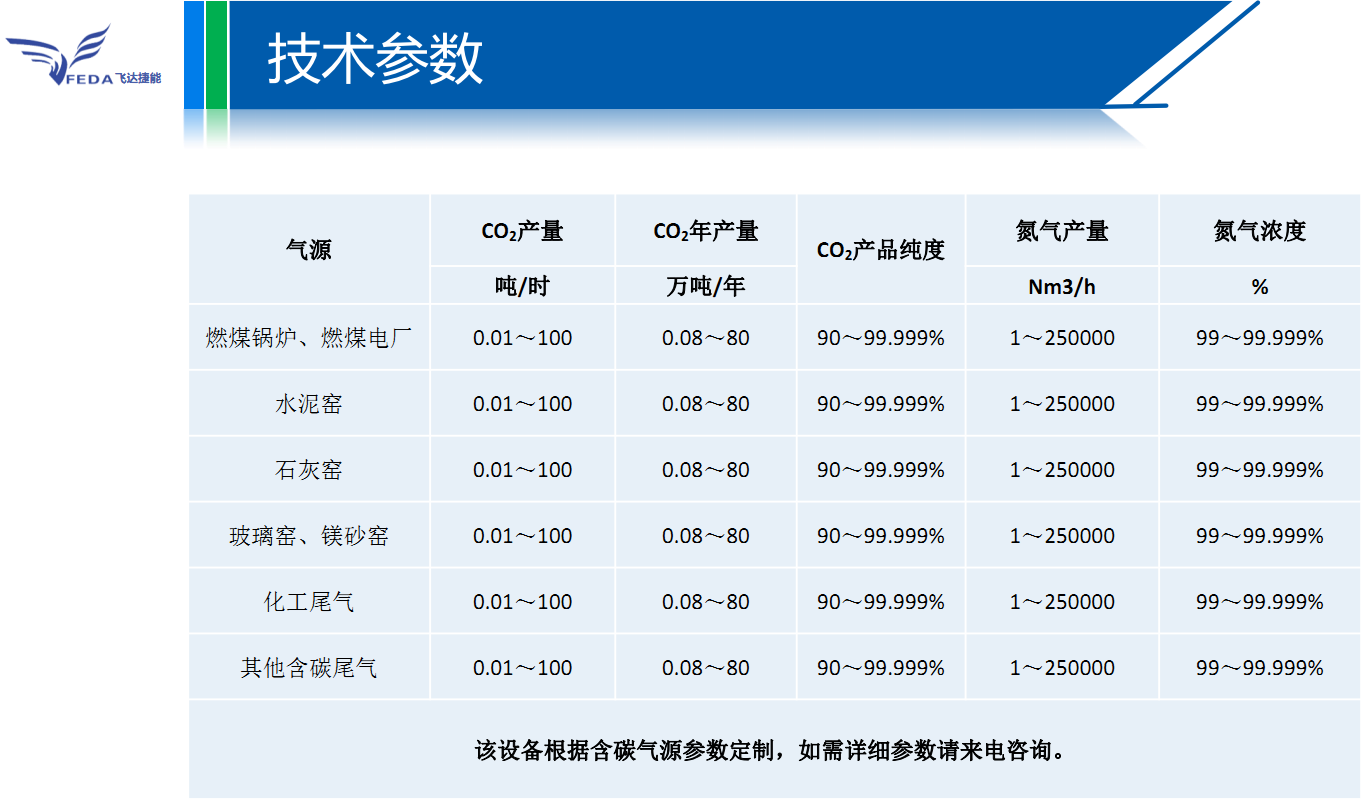 本系统采用变压吸附或化学法工艺将含二氧化碳气体分离为90%以上的二氧化碳气体和99.9%以上的氮气,二氧化碳可进一步提纯至99.9%以上的工业或者食品用产品,也可以经进一步净化提纯至99.999%以上的电子特种气体产品。